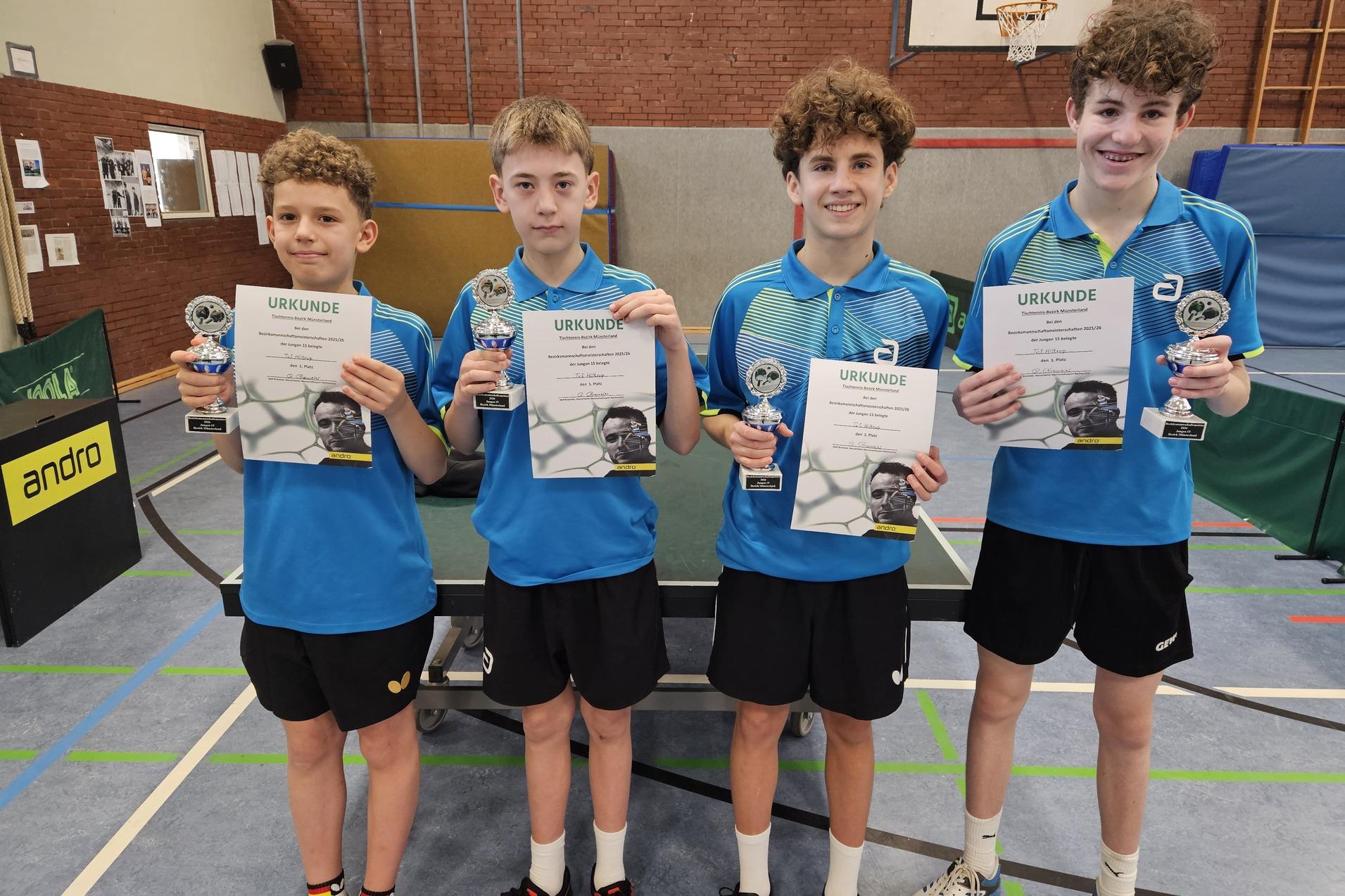 Als Top-Favorit gingen die Jungen 15 des TuS Hiltrup in die Mannschaftsmeisterschaften des Tischtennis-Bezirks Münster. In der Hiltruper Halle erfüllten Simon Hüwe, Philipp Schoofs, Hannes Schröder und Thilo Kastirke die hohen Erwartungen voll und ganz. Nach einem schwachen Doppel kamen die Hiltruper Jungs schnell auf Betriebstemperatur und landeten im Vorschlussrundenspiel einen 6:1-Sieg gegen Westfalia Kinderhaus und im Finale einen 6:0-Erfolg gegen den in der Summe mit rund 800 TTR-Punkten weniger notierten TSV Handorf.